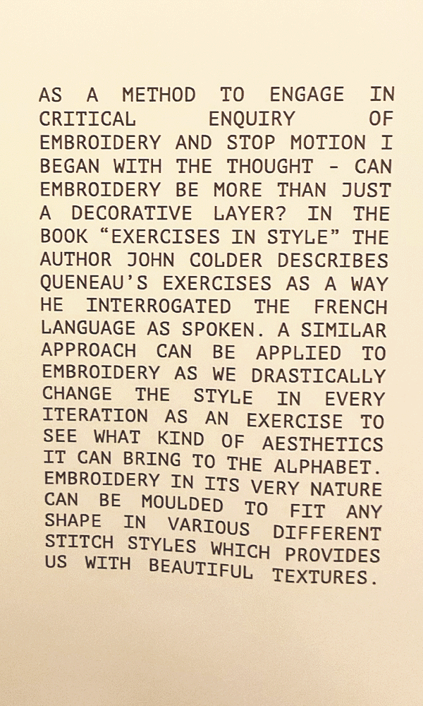 As a method to engage in critical enquiry of embroidery and stop motion I began with the thought – Can embroidery be more than just a decorative layer? In the book “Exercises in style” the author John Colder describes Queneau’s exercises as a way he interrogated the French Language as spoken. A similar approach can be applied to embroidery as we drastically change the style in every iteration as an exercise to see what kind of aesthetics it can bring to the alphabet. Embroidery in its very nature can be moulded to fit any shape in various different stitch styles which provides us with beautiful textures.